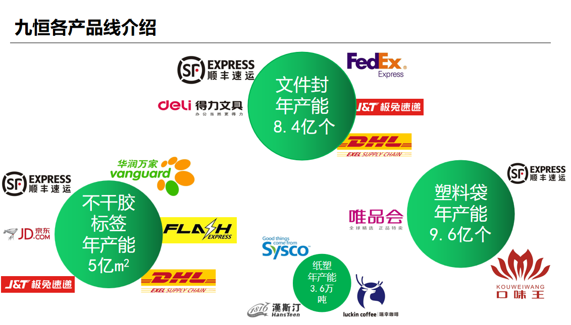 產品涵蓋電子面單、快遞運單及快遞包裝材料等全系列快遞物流應用材料產品,生產規(guī)模和綜合實力在行業(yè)內處于前列,也是行業(yè)內少數實現產業(yè)鏈延伸、提供全系列快遞物流應用材料產品及綜合服務的企業(yè)之一。目前公司憑借應用技術及產品創(chuàng)新優(yōu)勢,產品線向金融、醫(yī)藥、家用電器、環(huán)保紙塑等行業(yè)拓展,形成品類豐富的產品體系,產品市場占有率高達40%,涵蓋京東、順豐、郵政等2000多家知名企業(yè)。